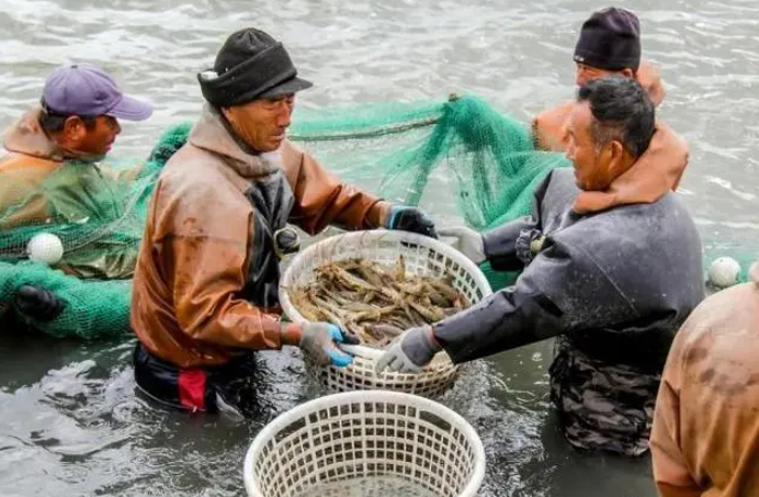 遼寧丹東,沿海養(yǎng)殖區(qū)漁民捕撈對蝦