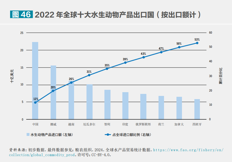2022 年全球十大水生動物產(chǎn)品出口國(按出口額計)。?糧農(nóng)組織