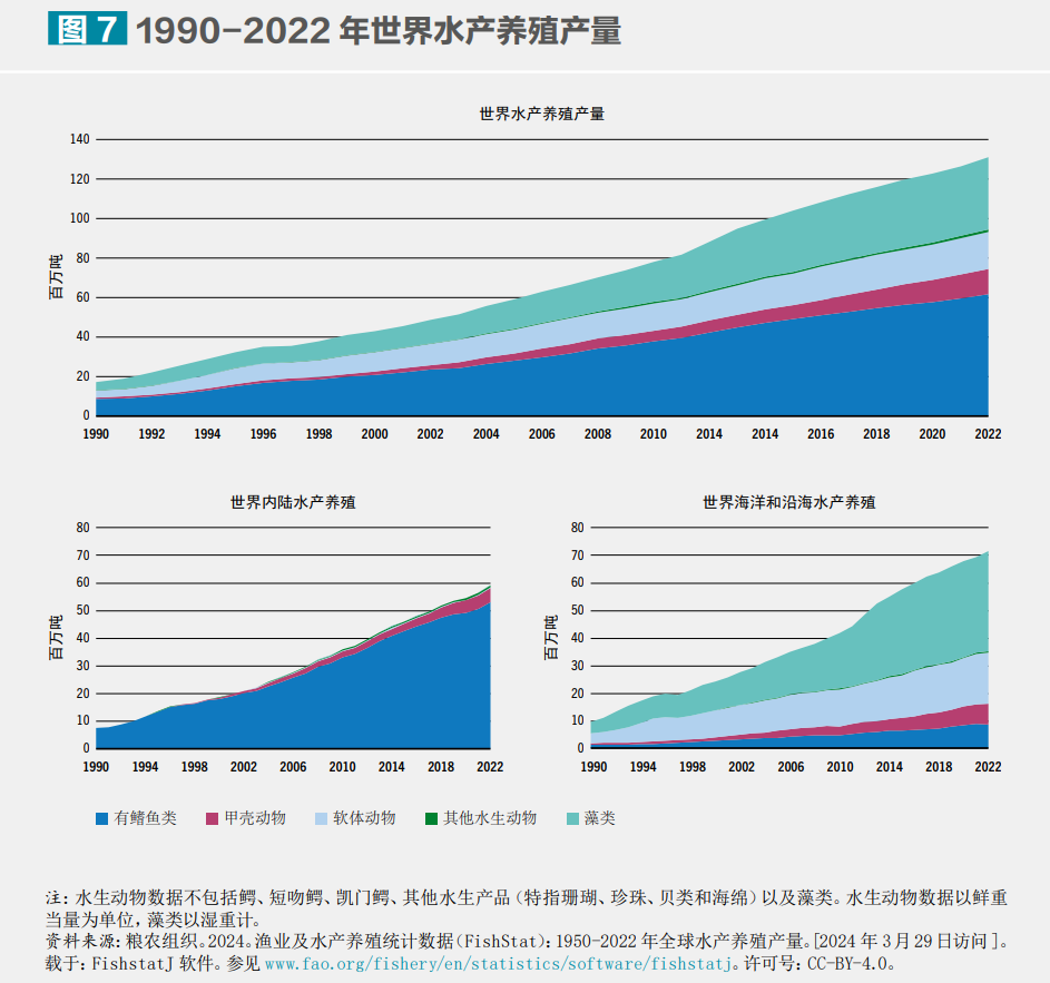 1990-2022年世界水產(chǎn)養(yǎng)殖產(chǎn)量變化圖。?糧農(nóng)組織