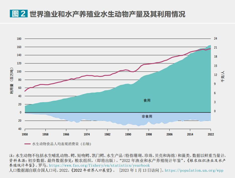 1950-2022年世界漁業(yè)和水產(chǎn)養(yǎng)殖業(yè)水生動物產(chǎn)量及其利用情況。?糧農(nóng)組織