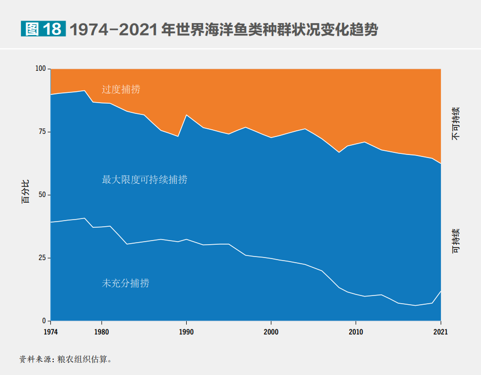 1974-2021年世界海洋魚類種群狀況變化趨勢。?糧農(nóng)組織