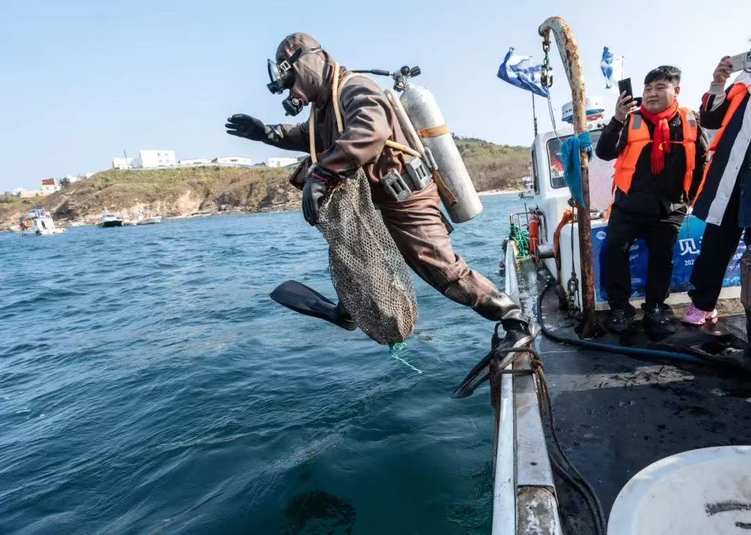 冬捕節(jié)當(dāng)天,漁民們載歌載舞唱響了冬捕節(jié)主題曲《采參謠》,傳遞著豐收的喜悅。20余名潛水員的鄭重宣誓:“感恩生態(tài),限量采捕”,表達(dá)了獐子島人對海洋始終懷有敬畏之心、感恩之情。伴著剛勁渾厚、鏗鏘有力的長海號子,全副武裝的潛水員們分乘30余艘漁船劈波斬浪、乘風(fēng)出海,直奔當(dāng)日源刺參采捕地——獐子島馬牙灘海域。