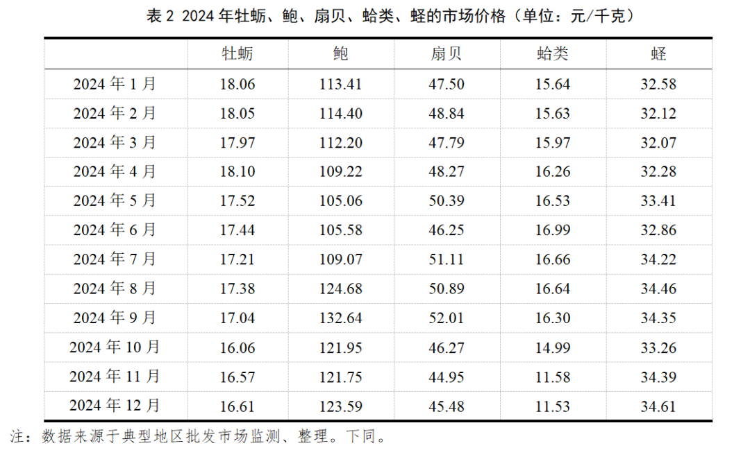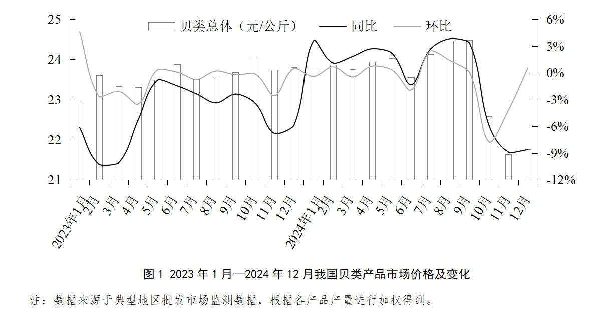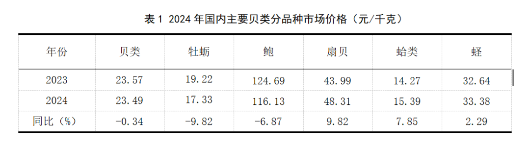 2024年,受產(chǎn)量較大的牡蠣和高價(jià)值的鮑的價(jià)格同比下降明顯影響,我國(guó)貝類產(chǎn)品總體價(jià)格同比穩(wěn)中微降,降幅為0.34%,其中第四季度我國(guó)貝類產(chǎn)品價(jià)格下降較明顯。相反,主要得益于產(chǎn)業(yè)鏈完整和供給增長(zhǎng)有限等,扇貝、蛤類的價(jià)格同比分別增長(zhǎng)9.82%、7.85%,蟶的價(jià)格同比增長(zhǎng)2.29%。