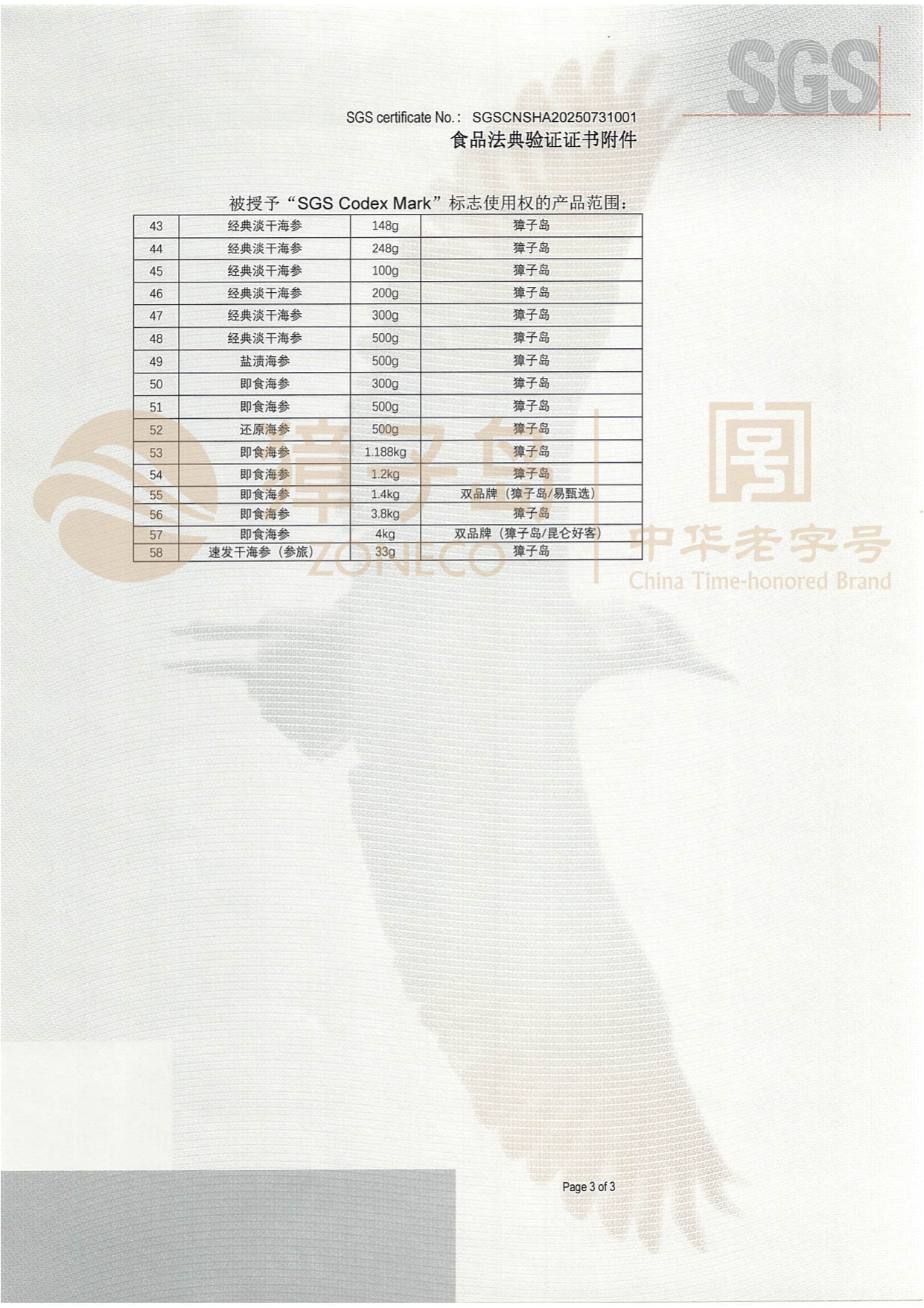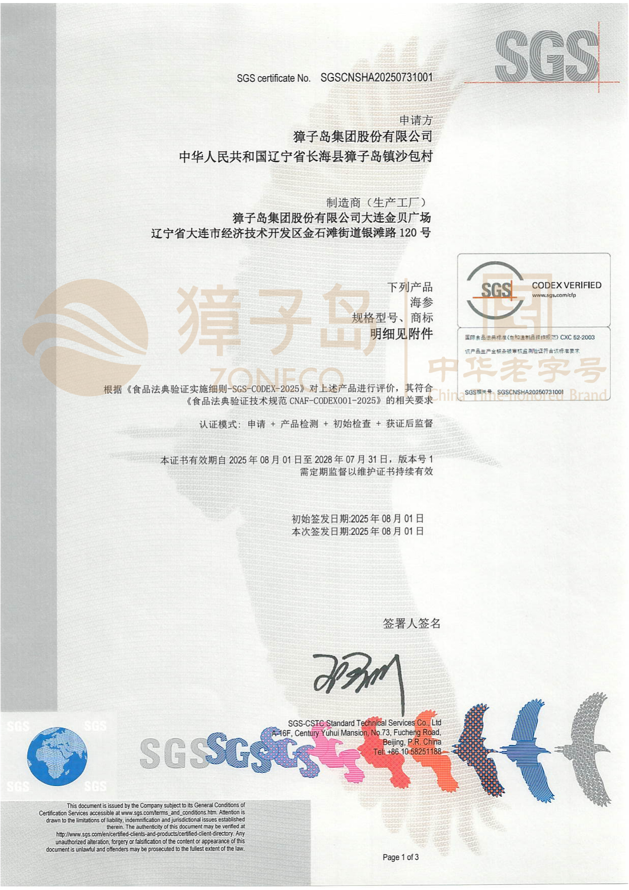 自2025年8月1日起,獐子島集團對海參產品進行了品質認證的全面升級,正式啟用全新的品質認證標志——SGS CODEX VERIFIED Mark(食品法典驗證)。這一舉措標志著獐子島集團在提升產品質量、保障消費者健康方面邁出了新的重要步伐,同時,集團也成為全球首個獲得SGS CODEX VERIFIED Mark標志授權使用的海參企業(yè)。