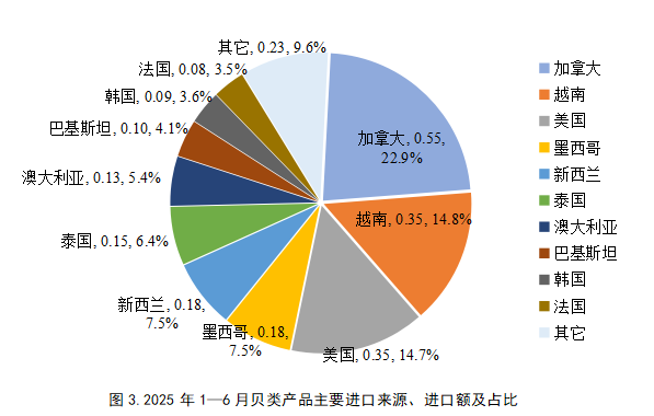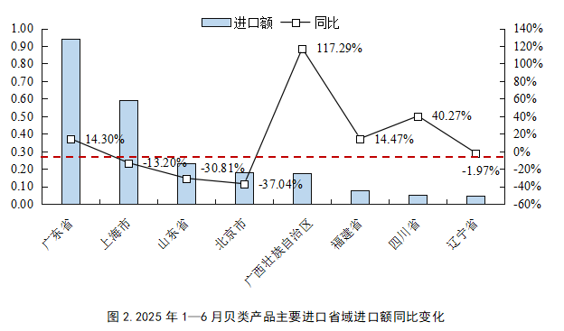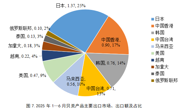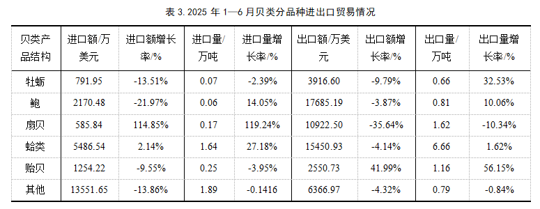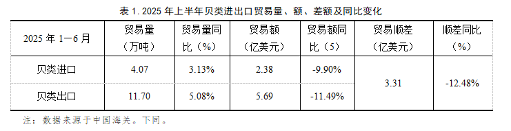 2025年上半年,我國(guó)貝類產(chǎn)品進(jìn)出口總量穩(wěn)中有增,但進(jìn)出口總額同步下降,總體呈現(xiàn)“量增額跌”的特征。