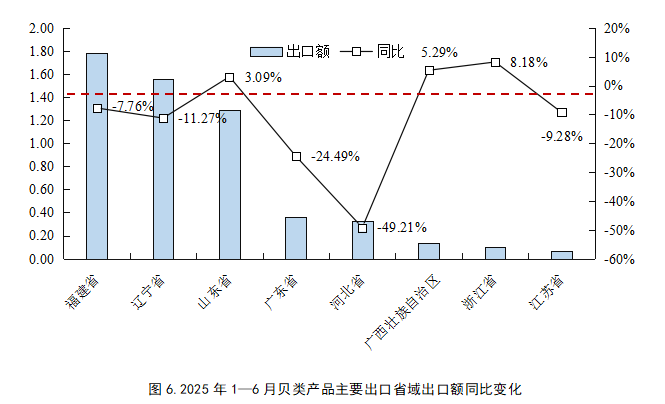 我國(guó)貝類出口省域集中于貝類生產(chǎn)的沿海區(qū)域。2025年上半年出口額排名前八的省份依次為福建、遼寧、山東、廣東、河北、廣西、浙江和江蘇,合計(jì)占全國(guó)出口總額的98.5%(見(jiàn)圖5)。其中,福建、遼寧和山東長(zhǎng)期保持領(lǐng)先地位。與上年同期相比,山東、廣西和浙江實(shí)現(xiàn)小幅增長(zhǎng),多數(shù)地區(qū)出口額同比下降,河北同比大幅下降49.21%,出口排名被廣東省超越(見(jiàn)圖6)。