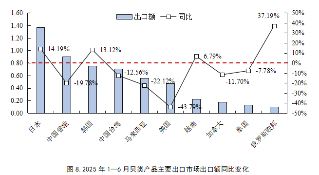 2025年上半年,我國(guó)貝類出口市場(chǎng)集中度較高,前十大市場(chǎng)為日本、中國(guó)香港、韓國(guó)、中國(guó)臺(tái)灣、馬來(lái)西亞、美國(guó)、越南、加拿大、泰國(guó)和俄羅斯聯(lián)邦,合計(jì)占比達(dá)94.9%(見(jiàn)圖7)。其中,日本、韓國(guó)、越南和俄羅斯聯(lián)邦實(shí)現(xiàn)同比增長(zhǎng),表現(xiàn)相對(duì)穩(wěn)健。相對(duì)而言,美國(guó)市場(chǎng)下降最為明顯,同比減少近44%,占總降幅的50%,為出口額下降的最主要原因,馬來(lái)西亞和中國(guó)香港也出現(xiàn)明顯下滑,這三個(gè)市場(chǎng)合計(jì)貢獻(xiàn)了超八成的出口額減少(見(jiàn)圖8)。整體來(lái)看,亞洲鄰近市場(chǎng)仍是我國(guó)貝類出口的主要支撐力量,而歐美市場(chǎng)需求疲軟、高門檻政策增加,成為影響出口額的重要因素。