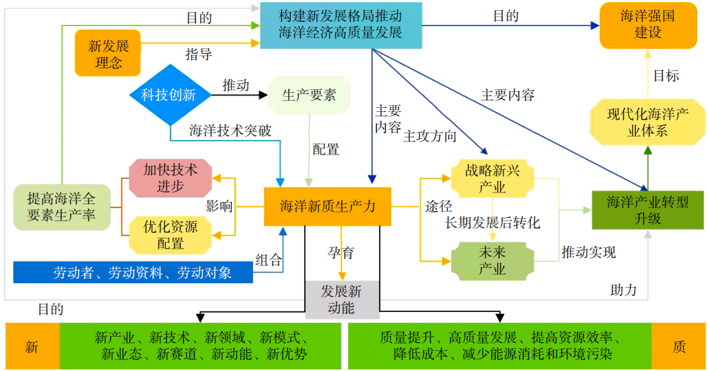 海洋經濟作為國民經濟的重要組成部分,其發(fā)展不僅為國家的經濟增長注入新動力,更為推動海洋科技創(chuàng)新、提升海洋產業(yè)競爭力提供廣闊空間。建設海洋強國,是以習近平同志為核心的黨中央基于國家發(fā)展大局的時代要求,也是中國特色社會主義事業(yè)的關鍵環(huán)節(jié)。基于此,我們在深入學習新質生產力權威解釋內涵的基礎上,結合海洋經濟發(fā)展現狀,進一步解讀海洋新質生產力的概念及內涵,初步提出海洋新質生產力的理論框架,并探索發(fā)展海洋新質生產力的實施路徑,以期為進一步踐行海洋強國戰(zhàn)略,促進海洋經濟高質量發(fā)展提供理論價值與實踐參考。