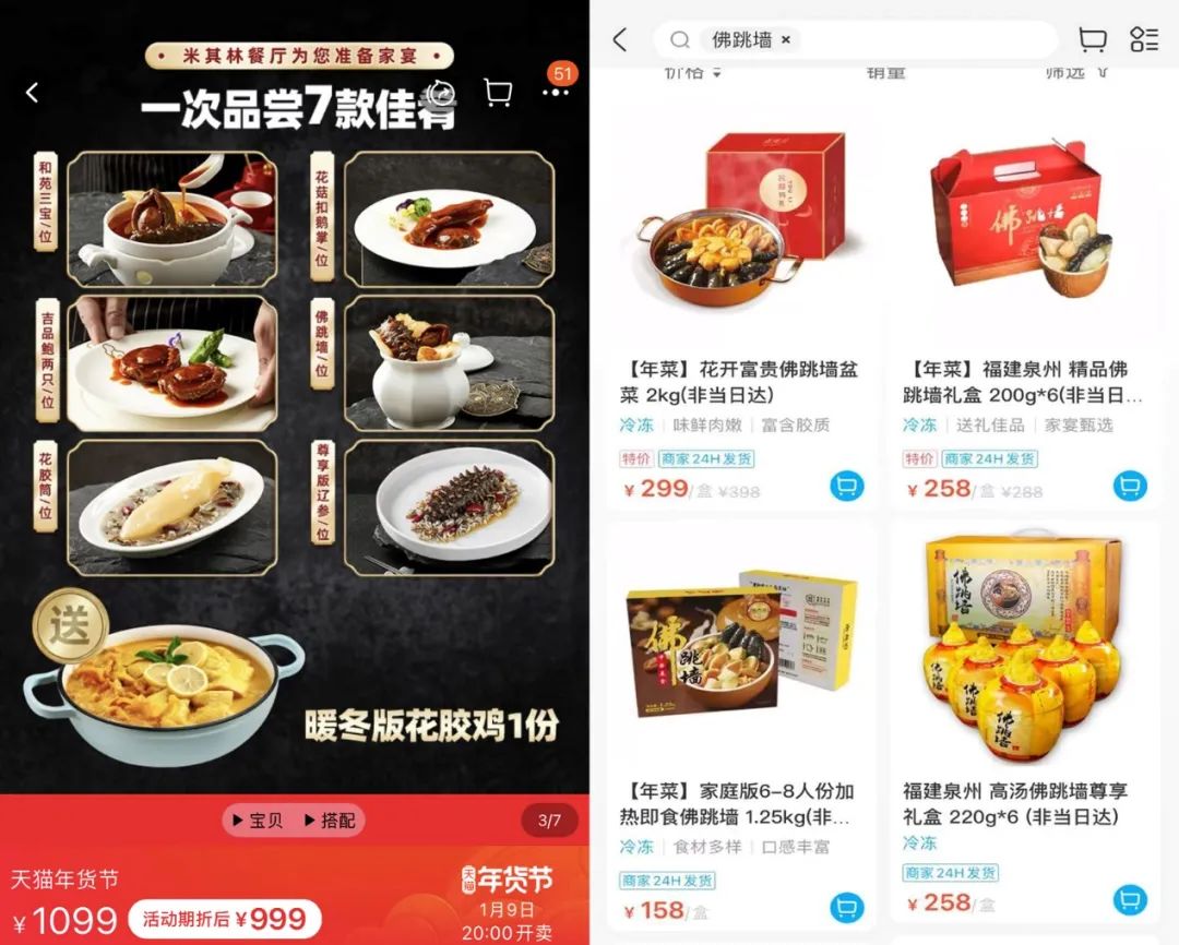 淘寶發(fā)布的年夜飯菜單中,佛跳墻連續(xù)三年穩(wěn)居高位。這款以工序復(fù)雜、食材豐富、烹飪耗時(shí)聞名的“閩菜之王”,毫不夸張地說(shuō),已經(jīng)在預(yù)制菜浪潮中泛濫成災(zāi),從拼多多到淘寶,從8.8元到468元,佛跳墻幾乎成了年夜飯中的硬通貨。